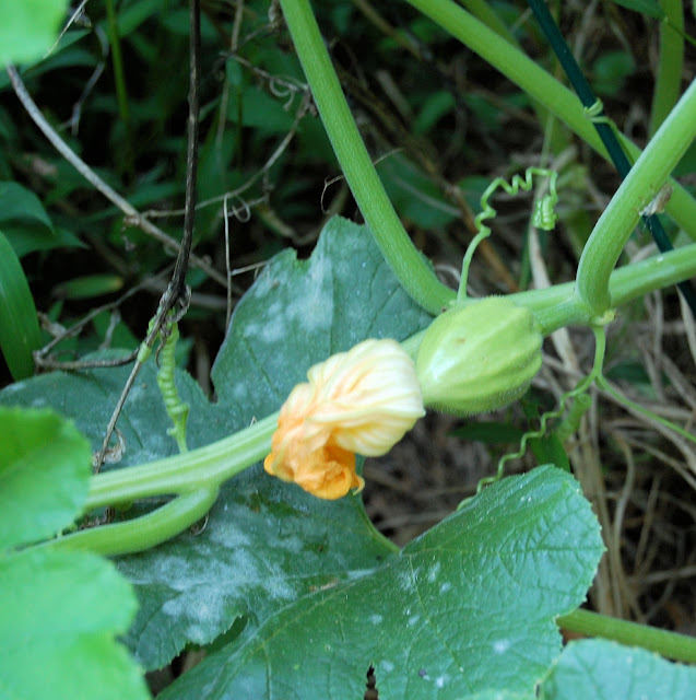 This year we planted two hills of Acorn squash...one of Table Ace and one of...um...something Queen (I know, I know.... I have it written down somewhere). They are doing TONS better than we anticipated. We have at least 3 or 4 lovely green squash set (it's kind of hard to locate them...so the count gets sketchy...), and the plants are still setting. Yes, they're getting a spot of downy mildew here and there, but it doesn't seem to be slowing them down!